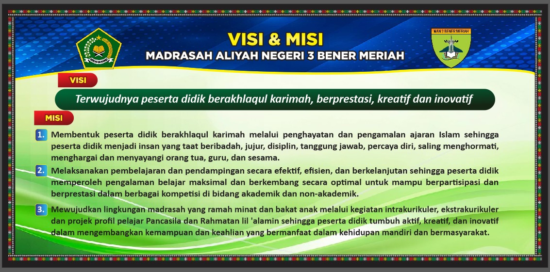 Seiring dengan perkembangan zaman dan persaingan yang semakin ketat perubahan yang semakin hebat MAN 3 hadir dengan mebuat visi baru MEWUJUDKAN SISWA SISWI YANG BERAKHLAQUL KARIMAH, BERPRESTASI, KREATIF DAN INOVATIF.
